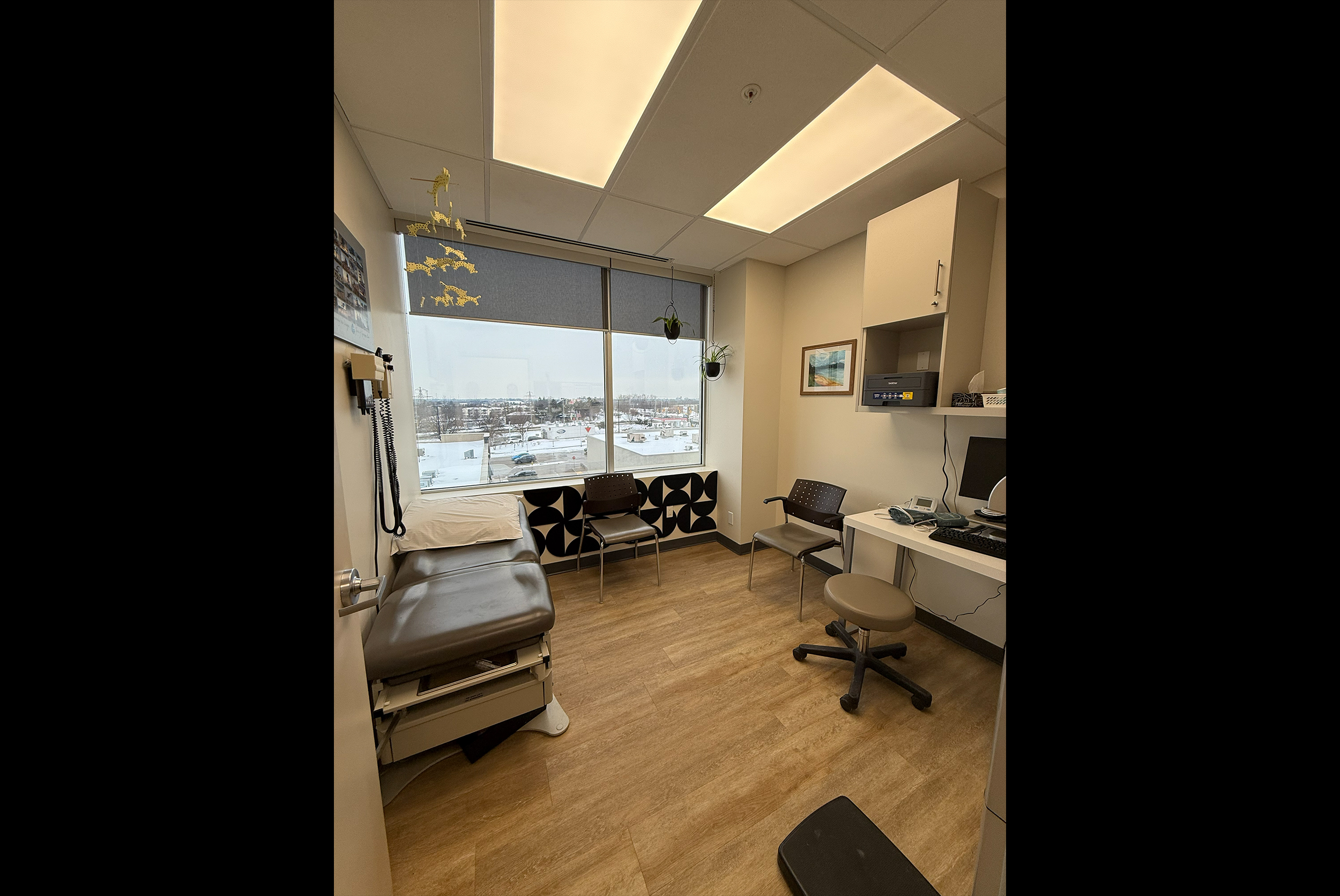 Unit 300, a 4,500 sq. ft. family doctor practice, is designed to accommodate a high-volume clinical setting. The layout includes 16 exam rooms, three private offices, and a shared bullpen workspace for five physicians. A combination of open and enclosed prep areas supports staff collaboration and flexibility, while a bright, welcoming waiting room enhances the patient experience. A dedicated staff room and separate physician entry further improve daily operations and privacy.